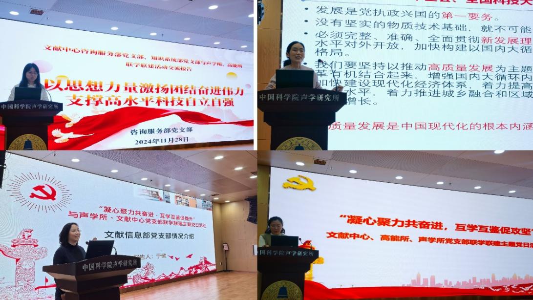 2024年11月28日,中國科學院文獻情報中心咨詢服務部黨支部、知識系統部黨支部,中國科學院高能物理研究所文獻信息部黨支部,中國科學院聲學研究所機關第二黨支部聯合開展了“凝心聚力共奮進,互學互鑒促攻堅”主題黨日活動。聲學所黨委委員、副所長、圖書館館長楊軍研究員應邀出席活動,30余名黨員參加了此次學習交流。