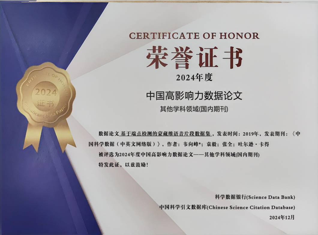 近日,中國科學院聲學研究所的論文《基于端點檢測的蒙藏維語音片段數據集》被評選為“2024年度中國高影響力數據論文”,并被授予榮譽證書。論文作者為:語音與智能信息處理實驗室的韋向峰、袁毅、張全及新疆財經大學吐爾遜·卡得。