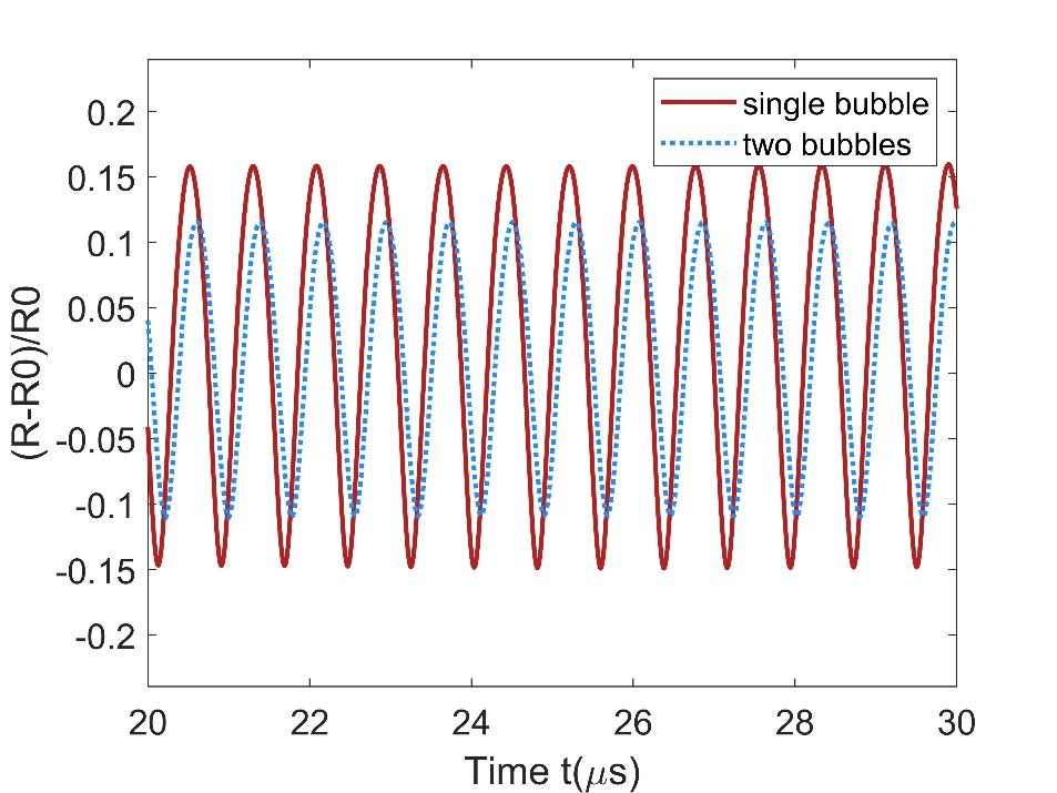 圖1 考慮和不考慮相互作用時的氣泡瞬時半徑(圖/中國科學院聲學研究所)