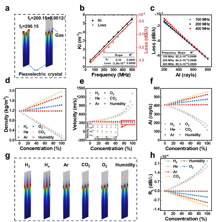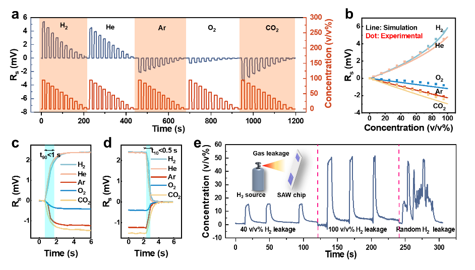 聲表面波技術(shù)作為一種微納尺度的聲學(xué)MEMS器件技術(shù),是氣體傳感技術(shù)的重要分支。王文研究團(tuán)隊(duì)提出了一種基于聲阻抗效應(yīng)的聲表面波氣體泄漏新機(jī)制,用氣體負(fù)載產(chǎn)生的聲阻抗變化來調(diào)制聲表面波傳播,實(shí)現(xiàn)了對氣體泄漏的實(shí)時快速監(jiān)測,且具備微尺度、低功耗等特點(diǎn)。試驗(yàn)結(jié)果顯示,基于聲阻抗效應(yīng)的泄漏傳感器成功實(shí)現(xiàn)了氫氣、氦氣、氬氣、氧氣、二氧化碳等氣體的快速(T90<1s,T10<0.5s)與寬量程(0-100%vol)泄漏檢測,同時該技術(shù)可實(shí)時動態(tài)地獲取呼吸速率、深度以及呼吸狀態(tài)等關(guān)鍵生理參數(shù),在人體健康監(jiān)測領(lǐng)域也具有良好的應(yīng)用前景。