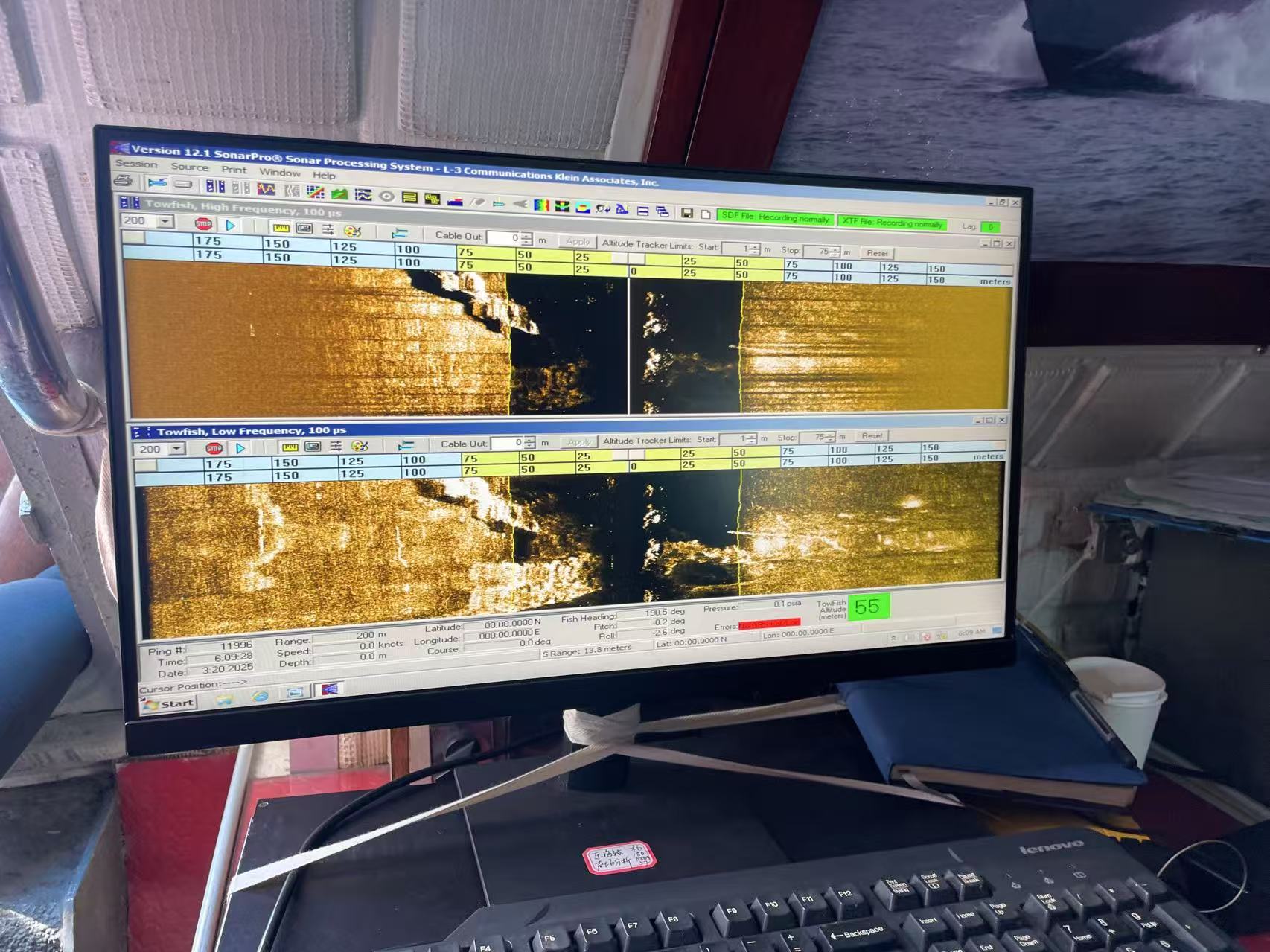 試驗當天,他們按照規劃好的十字交叉側掃航路,先從北向南進行掃測,然后又從東向西進行掃測,獲得了不同方位的沉船聲圖,從而確定了沉船的位置。